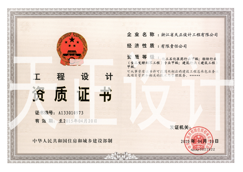 经省建设厅、国家建设部审查核准,我司顺利通过工程勘察设计资质换证,保留了原有甲、乙级工程设计资质中的业务范围。新的工程设计资质范围为:化工石化医药行业甲级、轻纺行业(食品发酵烟草工程)专业甲级、建筑行业(建筑工程)甲级;环境工程(大气污染防治工程、水污染防治工程)专项乙级、轻纺行业(化纤工程、化纤原料工程)专项乙级、商物粮行业乙级、市政行业(城镇燃气工程、给水工程、环境卫生工程、排水工程、热力工程)专项乙级。可从事资质证书许可范围内相应的建设工程总承包业务以及项目管理和相关的技术与管理服务。